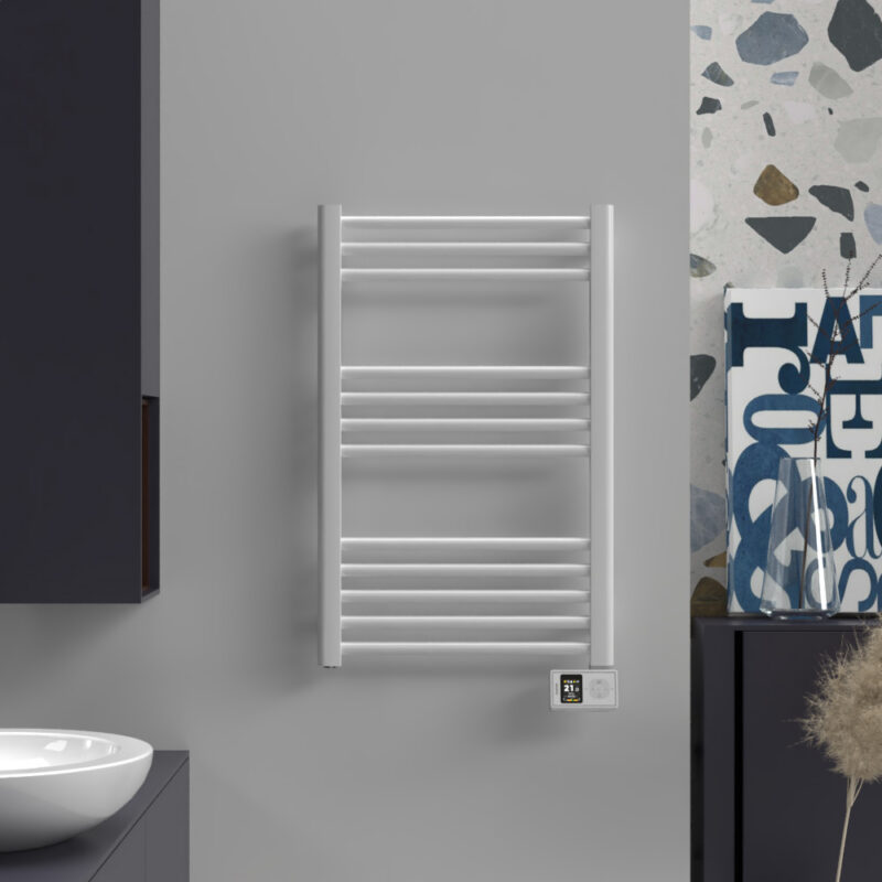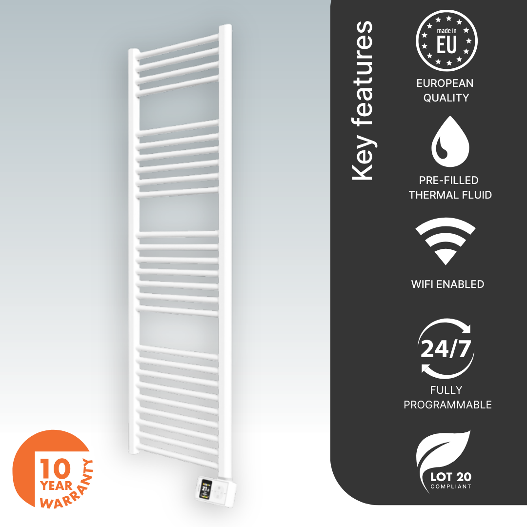 The Orion Heated Towel Rail by Rointe provides efficient heating and towel-warming for bathrooms of up to 7.5 m². The thermal fluid core and steel lader-style body keep towels warm and dry, and your bathroom comfortable. Low power consumption and a modern styling make the Orion a great choice for any new or refurbished bathroom. The Orion features a touch screen tilted at 30° to enhance usability. Integrated direct WiFi connectivity enables control from the Rointe NEXA app which includes handy functions like control locking, 24hr timer, boost, and automatic modes.